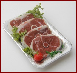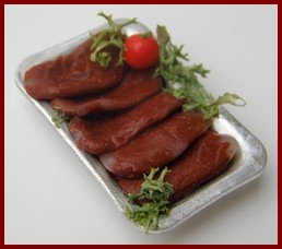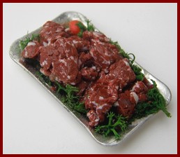 Hand made meat pieces in a metal tray with trimmings, for a butchers shop display