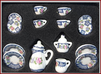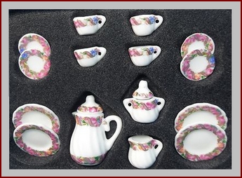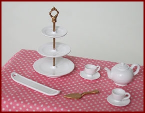 An exquisite fine detailed resin Afternoon Tea set consisting of two cups and saucers, teapot, three tier cake stand, long cake plate and cake slice.